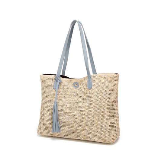Trimmed Vegan Leather Strap Straw Tote