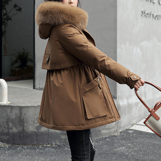 Womens Mid Length Drawstring Waist Jacket with Furry Hood