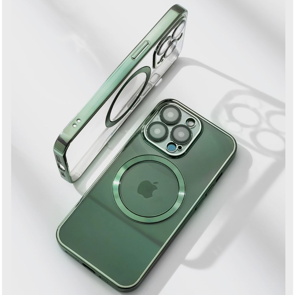 Color frame clear slim case for iPhone, features a protective lens film and magnetic ring for wireless charging.