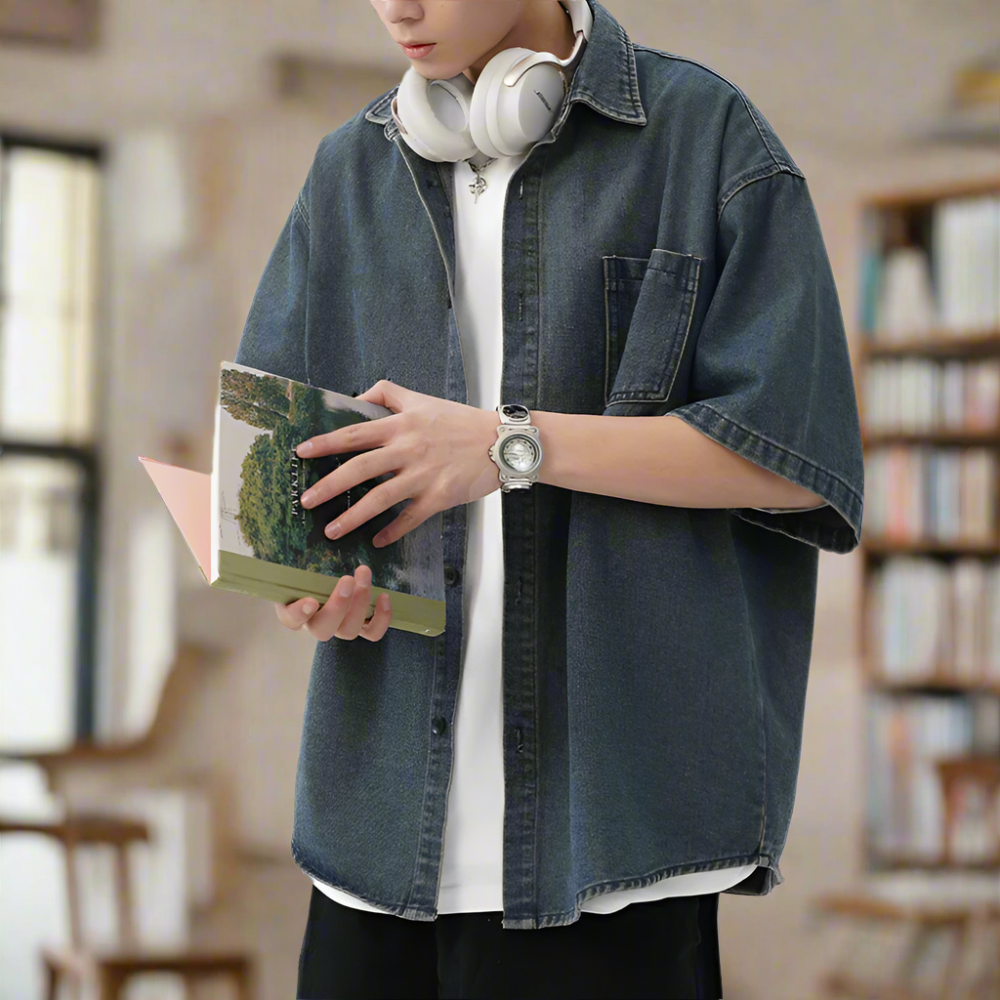 Men 's Over Size Washed Denim Short Sleeve Shirt