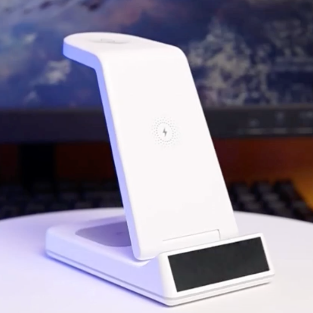This foldable and portable 5 in 1 wireless charging station supports both iPhone and Android phone that supports wireless charge. It can also charge Apple Watch and Airpods at the same time. The viewing angle can be adjusted from 0 - 67 degrees to fit what you need. It also has a night light and digital alarm clock build in, it is suitable for home, office and travel, providing you a true wireless experience.