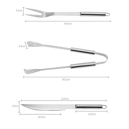 Premium barbecue camping cooking utensils, includes knife, tongs, serving fork. Featuring heat proof handles for easy usage.