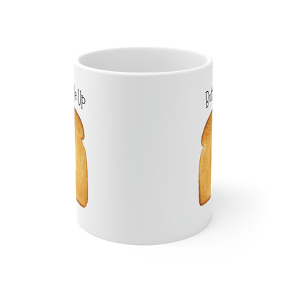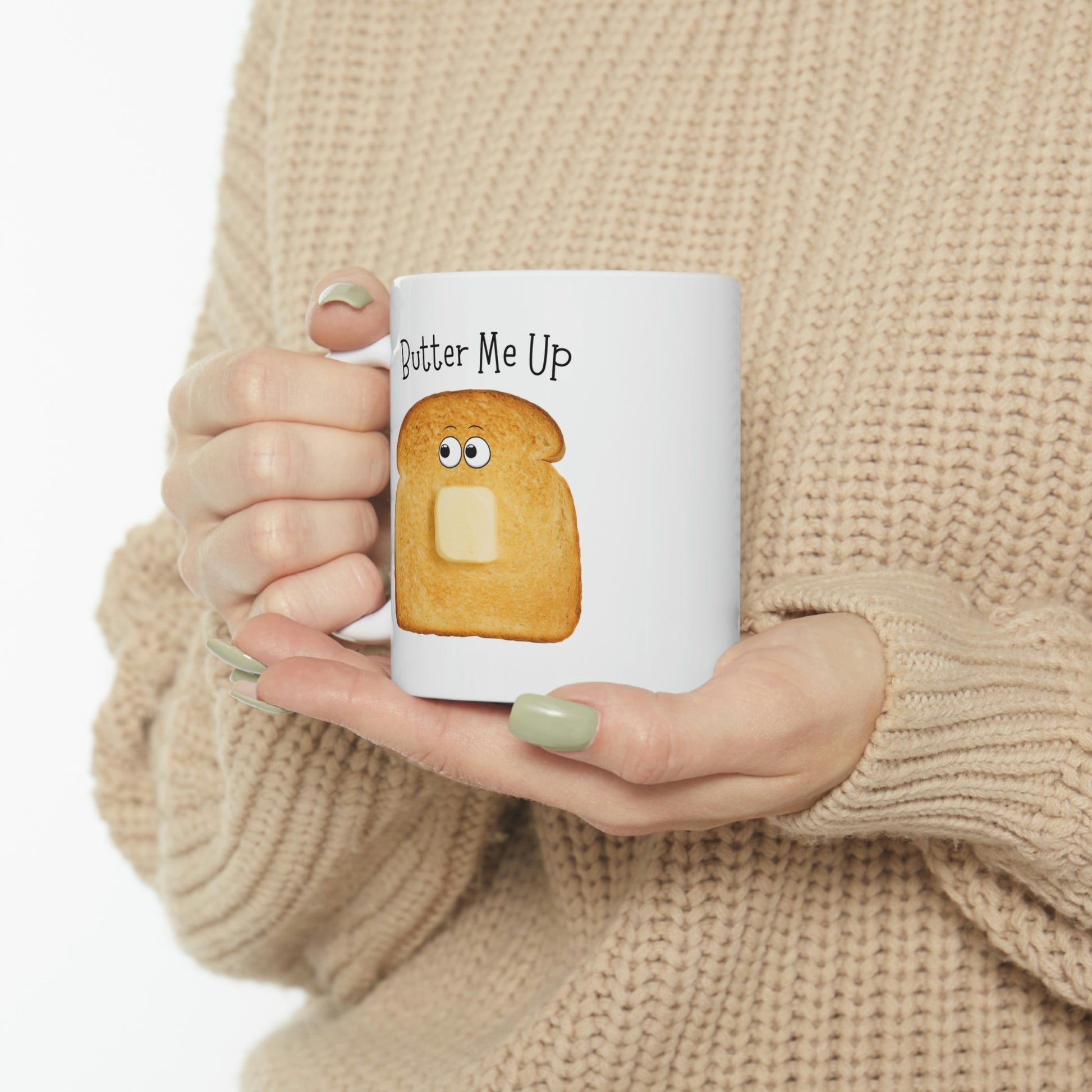 Butter Me Up Toast Novelty Mug. It’s microwave & dishwasher-safe and made of white, durable ceramic in an 11-ounce size. The perfect gift for the coffee, tea, and chocolate lovers.