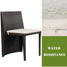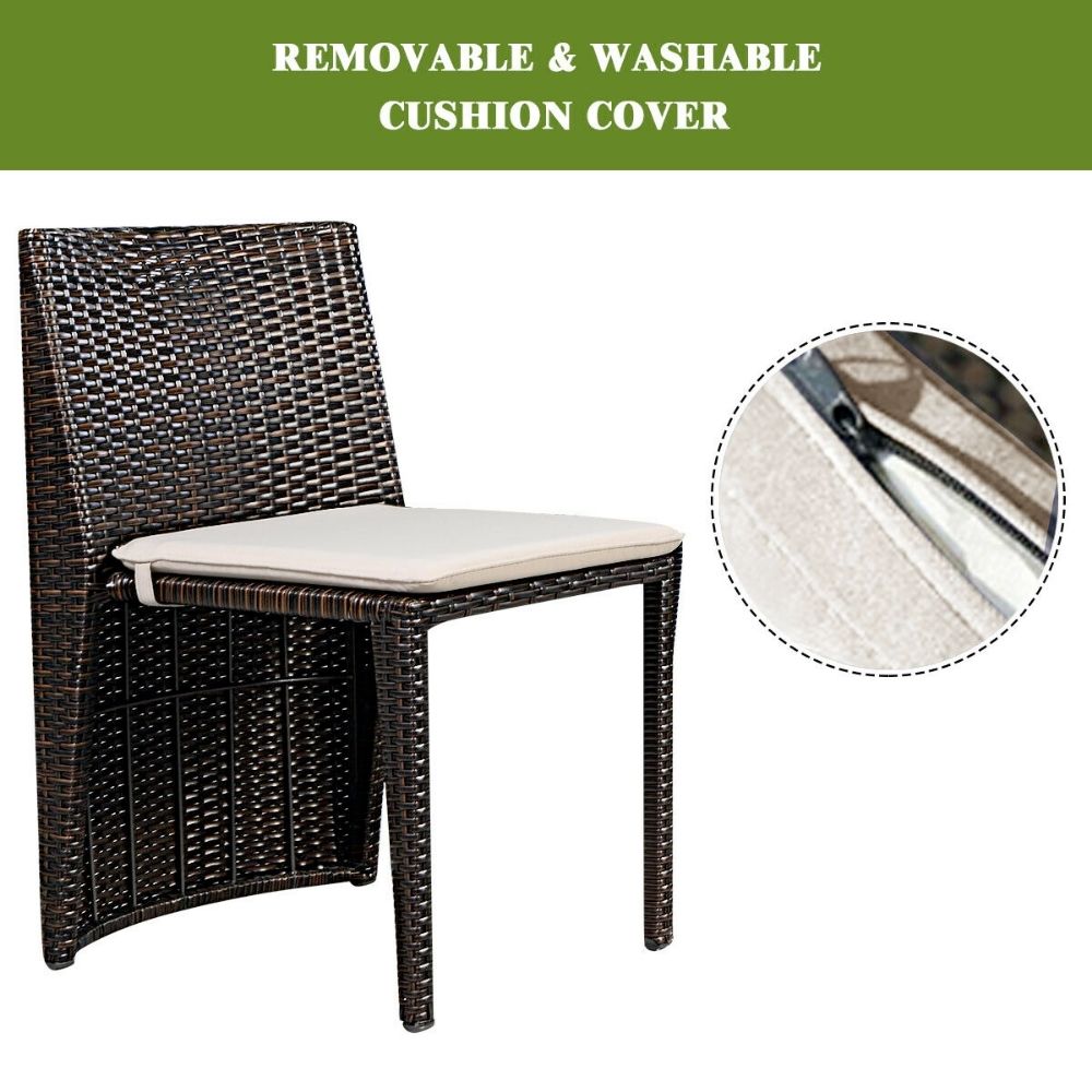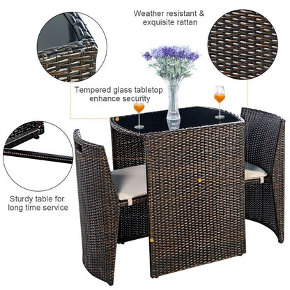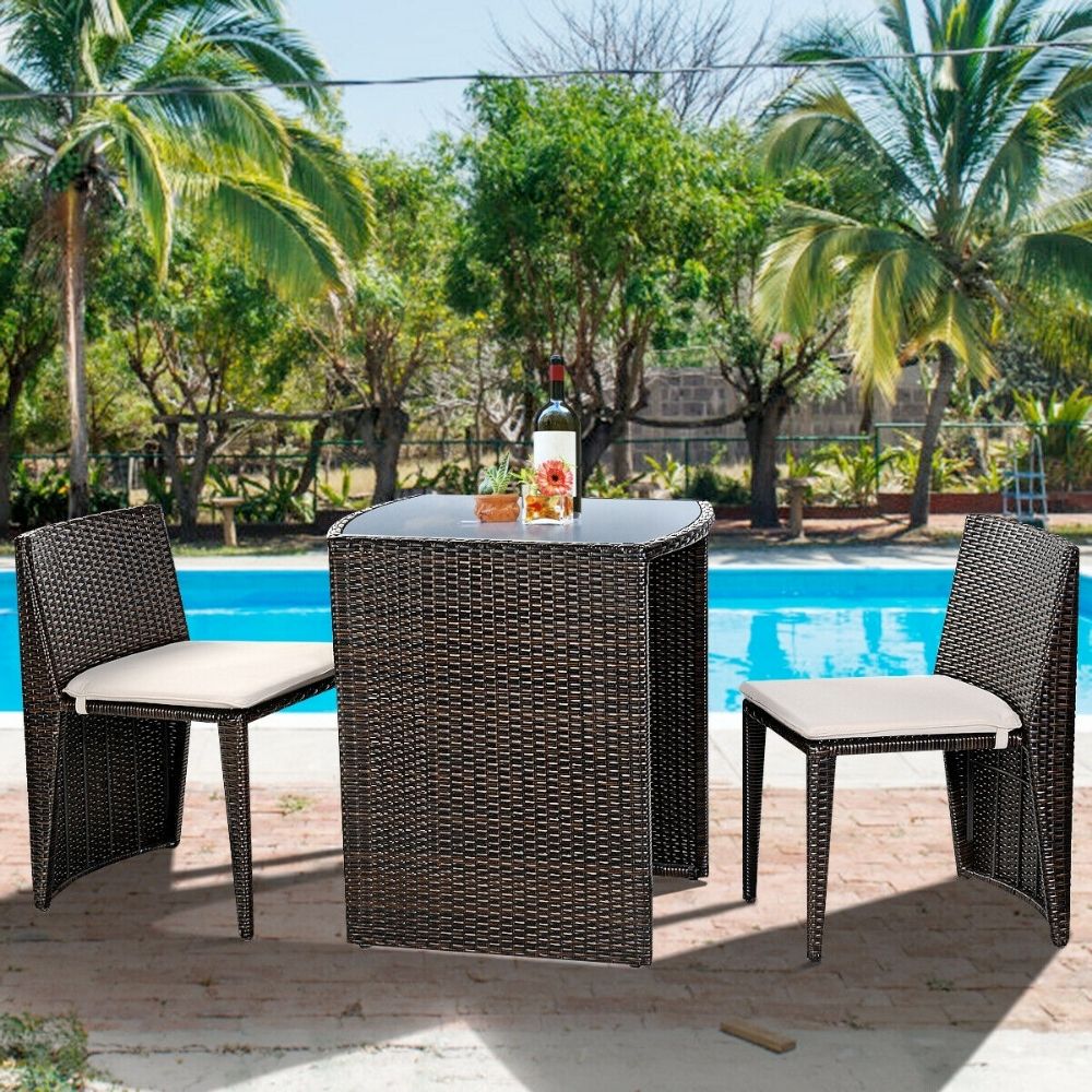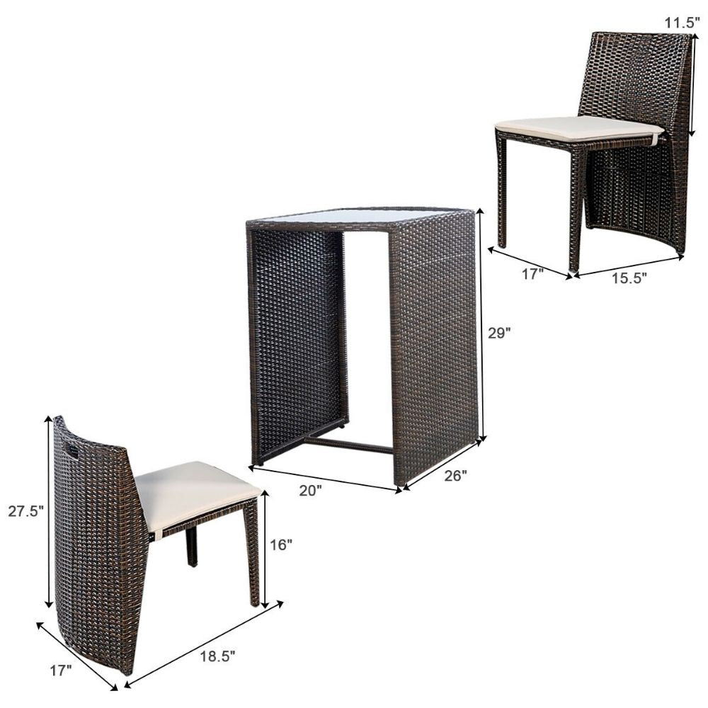 Outdoor patio wicker 3 piece patio furniture set includes 2 chairs and 1 small table, with stable tempered glass tabletop. Chair is cushioned with removable and washable cushion cover. Makes a cute addition to the garden, patio, balcony or dining room.