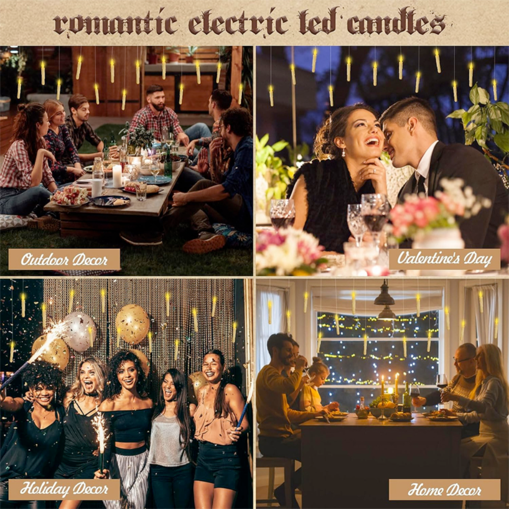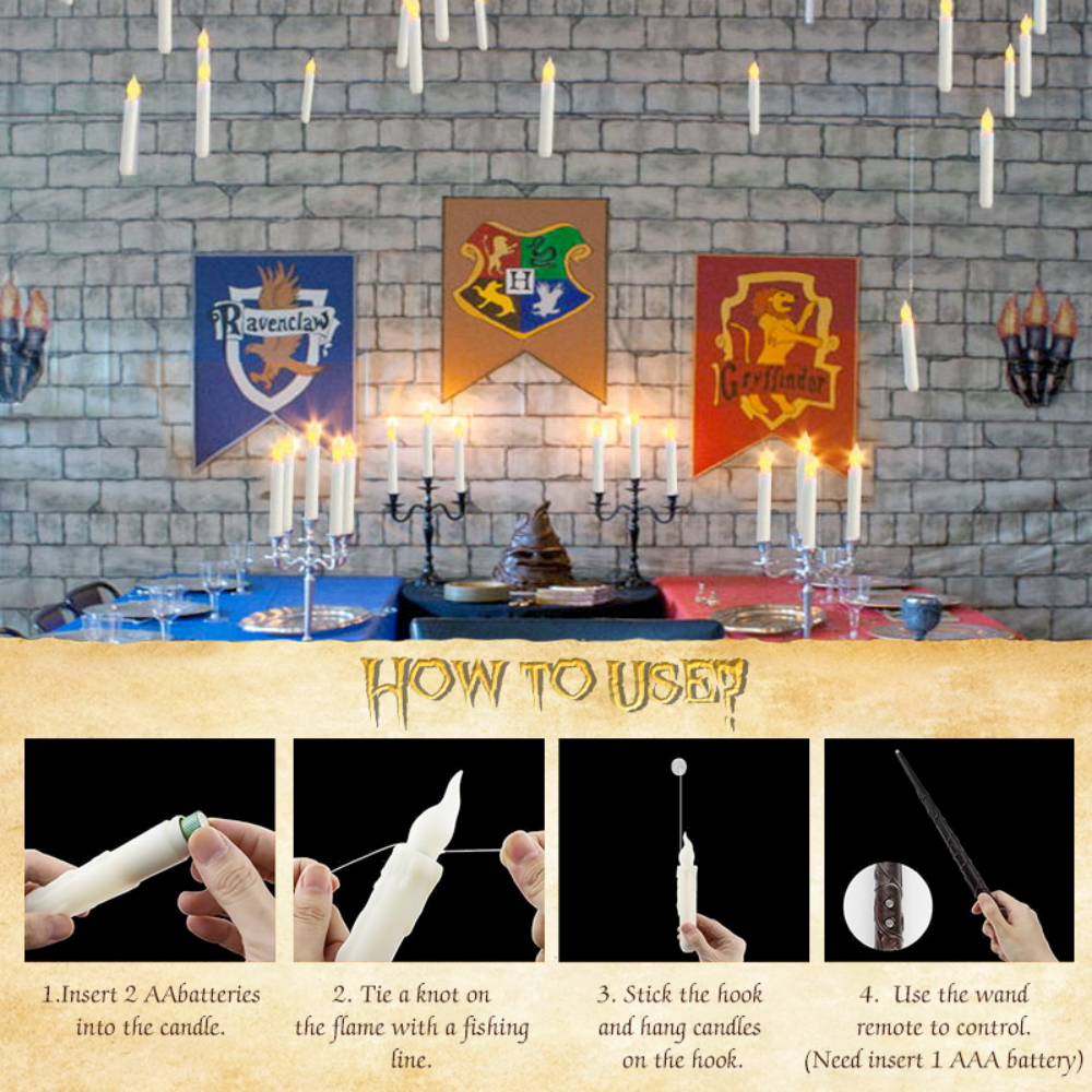 Create a whimsical atmosphere with these enchanting floating candles. Crafted from durable plastic with built-in LED lights and comes in captivating yellow flashing lights. Simply activate the rotary switch on the wand to illuminate candles. Each set includes a convenient 2-button remote control for the magic wand, ensuring easy operation. Perfect for adding a touch of magic to any occasion, from Halloween and Christmas to weddings and theme parties. They're versatile decorations, suitable for hanging from ceilings, trees, archways, or placing in windows
