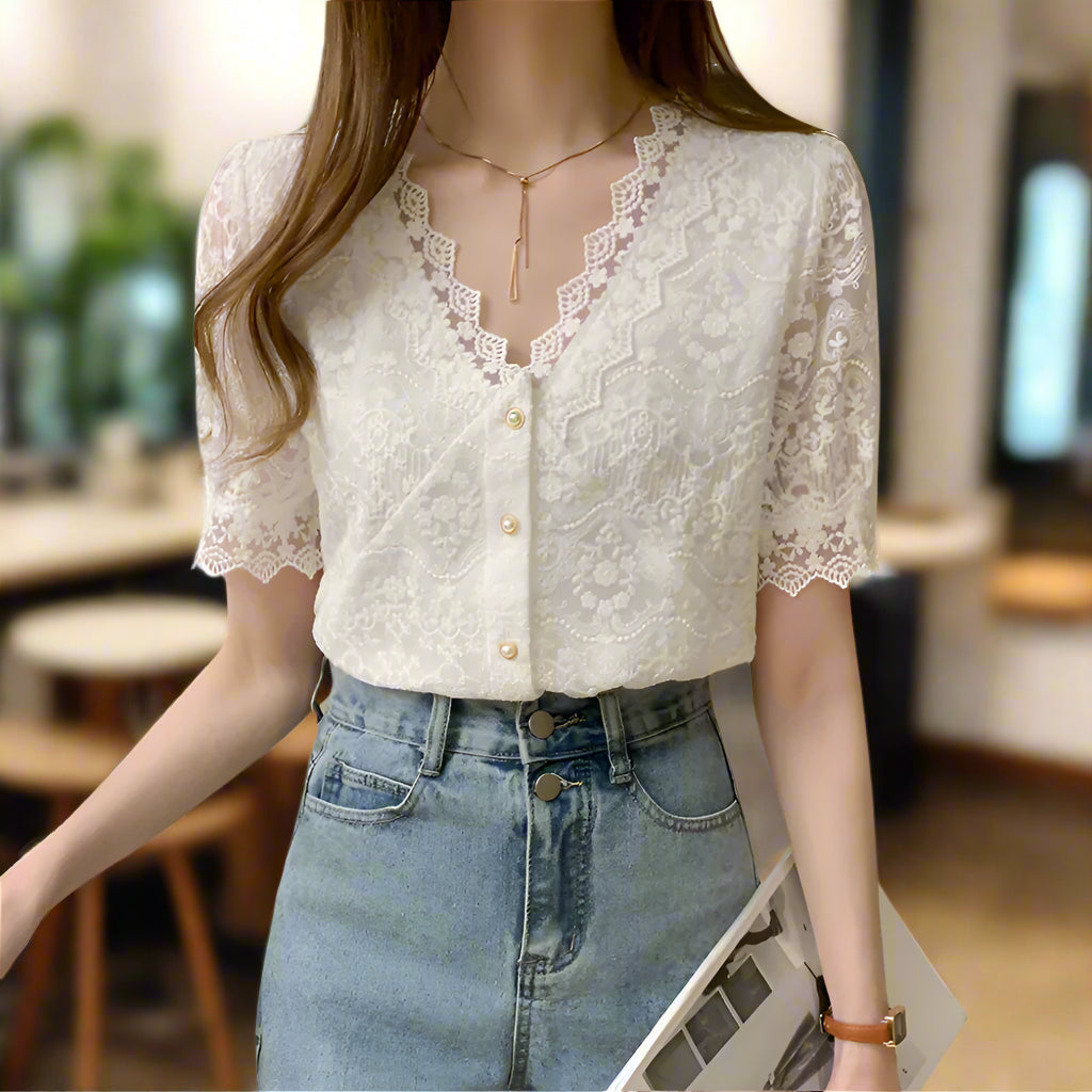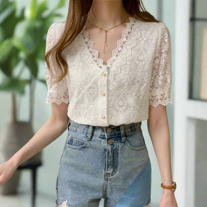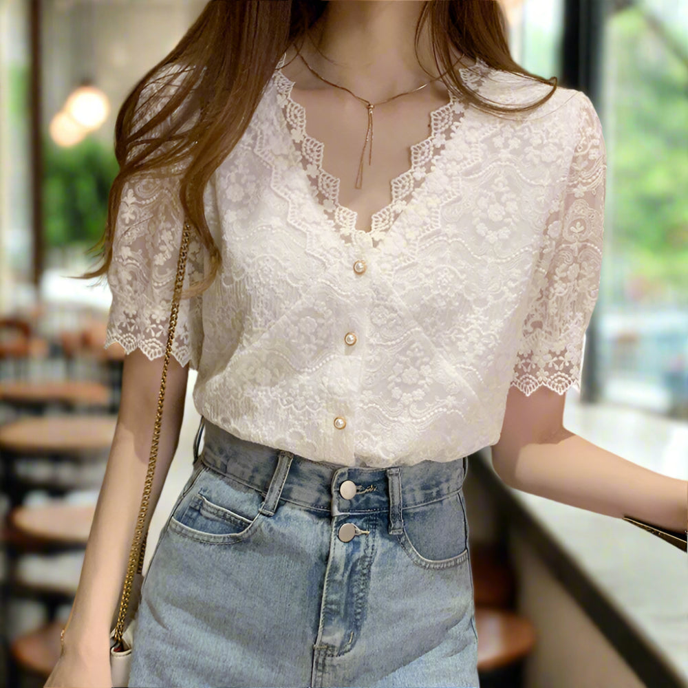 Discover the perfect blend of style and comfort with our Women's V-Neck Lace Top! Shop now to add this versatile, chic piece to your summer collection and shine effortlessly.