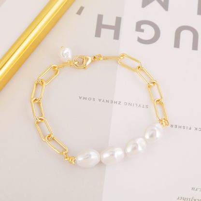 This gold plated link bracelet with faux pearl beads can easily fit into your daily look!