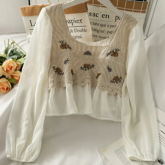 Womens Crocheted Blouse with Floral Chiffon Layered Top