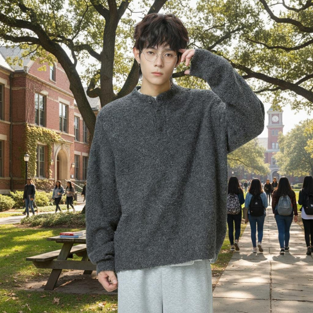 Half-button placket, raw-edge neckline, and dropped shoulders create that sought-after Korean-streetwear vibe. Easy to layer or wear solo – instantly makes any outfit look thoughtfully cool while staying effortlessly understated and modern.