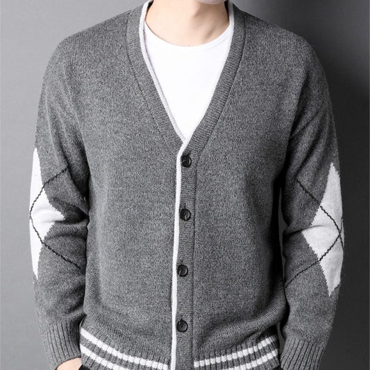 Mens V Neck Cardigan with Criss Cross Elbow Patch