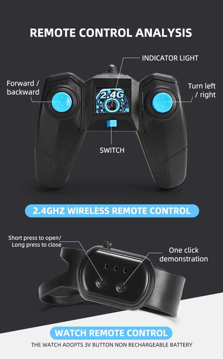 Dual control system. Comes with a remote control and a wearable control.