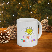 Cup of Sunshine Positive Quote Mug. It’s microwave & dishwasher-safe and made of white, durable ceramic in an 11-ounce size. The perfect gift for the coffee, tea, and chocolate lovers.