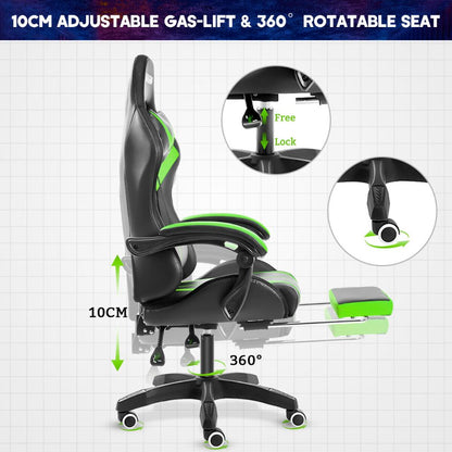The new addition to your gaming experience, the Premium Vegan Leather Office and Gaming Massage Chair with LED lights. This super comfy chair is equipped with a massaging system to help instantly relax your back, with adjustable lumbar support. Give yourself a break after working long hours at your desk with this ergonomic body hugging design chair.