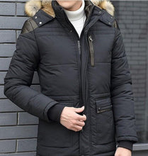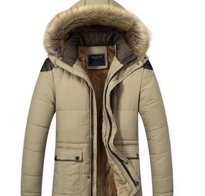 Mens Winter Hooded Coat comes in Beige, Black or Blue and from Small to Large.