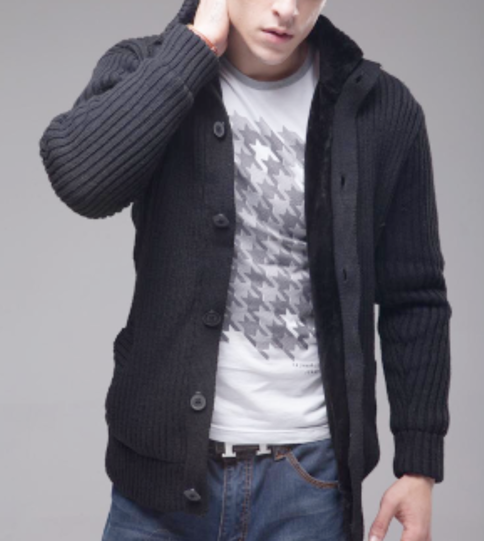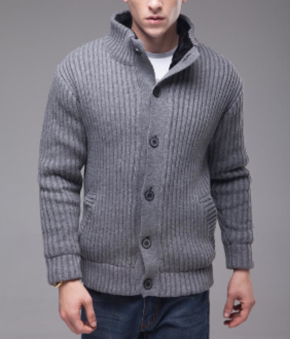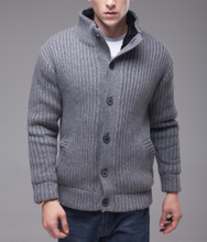 Mens stand collar ultra warm cardigan with inner faux fur lining.
