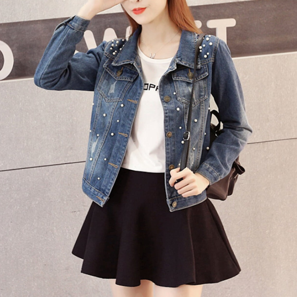 Express yourself in our timeless Womens denim jacket with intricate pearl detailing. An effortlessly stylish piece you can layer with any outfit for a unique and fresh look. Embrace your inner fashionista and add a hint of elegance to your look!