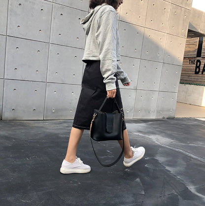 Womens Vegan Leather Bucket Bag With Wide Shoulder Strap