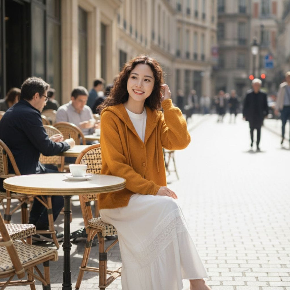 Intricate open-knit hood adds airy romance and texture unlike any cardigan. Light yet warm, it frames the face beautifully and transforms a simple layer into a quiet statement piece.