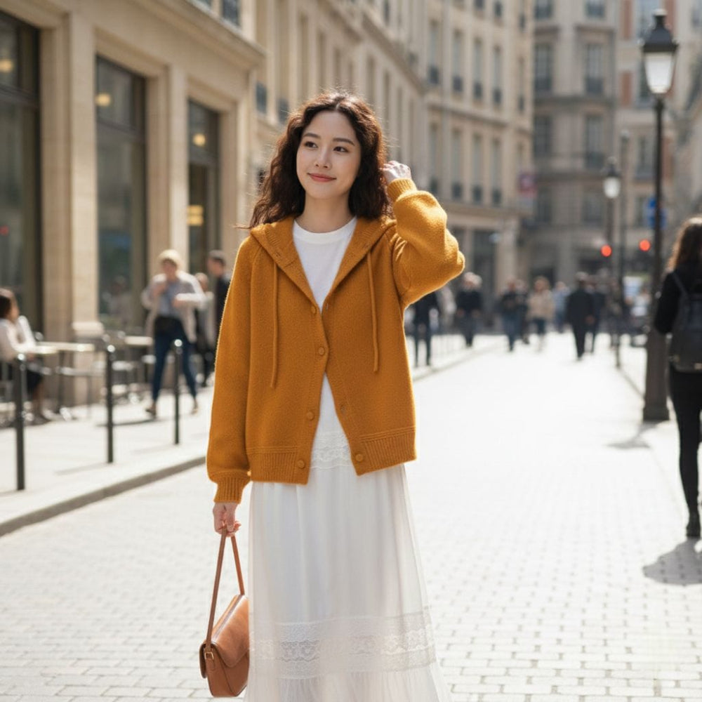 Your new everyday favorite. This soft button-down cardigan gets a dreamy upgrade with a delicate hollow-knit hood – cozy, unique, and effortlessly stylish for daily wear.