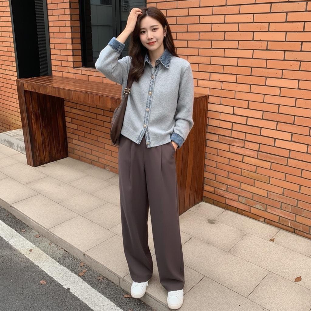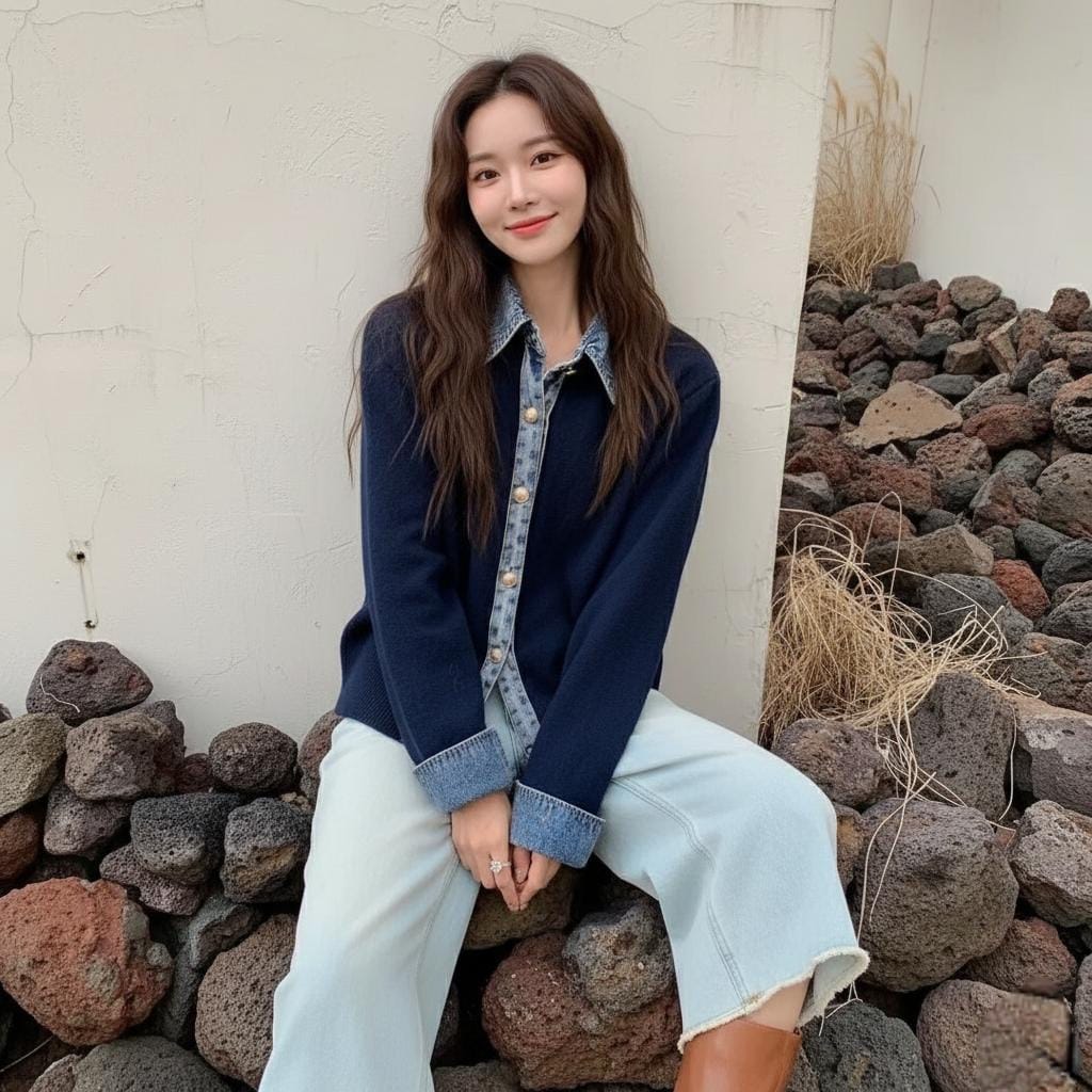 Contrast denim shirt details (collar, placket, cuffs) peek out like layered perfection. No extra shirt needed – instantly adds texture, edge, and that “I just threw this on” cool without any effort.