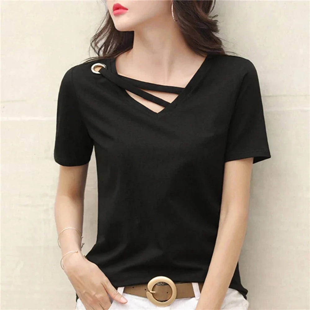 Elevate your summer wardrobe with the Women's Korean Fashion V-Neck Summer Top, a perfect blend of style and comfort. This chic top features a flattering V-neckline that accentuates your collarbone, adding a touch of elegance to your casual ensemble. Made from lightweight, breathable fabric, it ensures you stay cool and comfortable even on the hottest days.