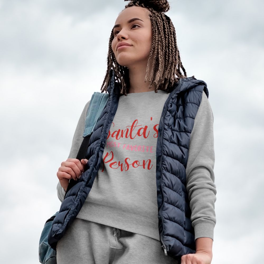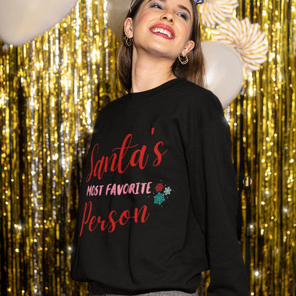 Get festive this holiday with this Santa's Favorite Person holiday comfy soft sweatshirt, features a loose fit for a comfortable feel. The collar is ribbed knit, so it retains its shape even after washing.